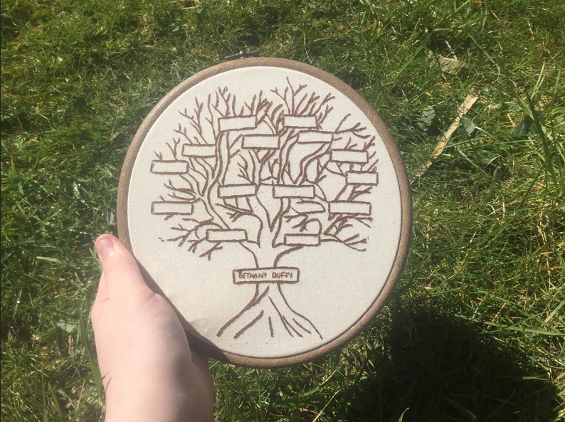 1) This lovely design from BethanyVictoriaDuffy. This shop also sells finished family trees if you don’t have the time to embroider it yourself.